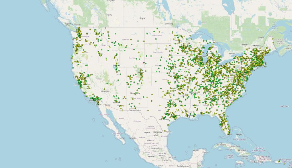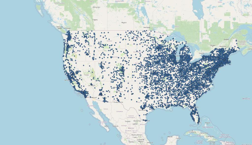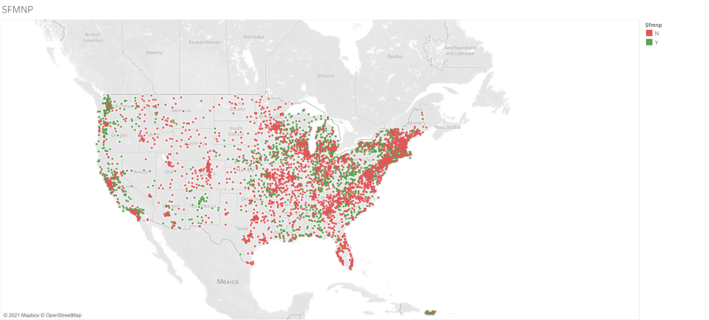 A plot analysis of products available of zip code showed few surprises – fewer markets sold cheese and coffee than expected. Markets selling organic products were largely concentrated on the west coast and north east. Maple products as expected were concentrated in the north east markets.