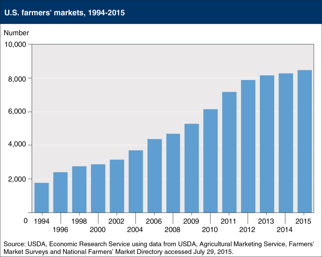 Farmers markets have been around for about thousands of years, and probably were one of the first points of business where people brought food for daily consumption. Some studies indicate that farmers’ markets existed in Egypt 5000 years ago. In the U.S. modern farmers’ markets first appeared in the 1600s and were the primary means for people to buy food. The popularity of the farmers’ markets held steady from then to the 1900s, and apart from being points of business also became hubs of social interaction. After World War II, with better transportation and more stores the popularity of farmers markets waned from the 1950s to 1970s. In the 1970s there was a resurgence of interest in farmers markets. The USDA officially began to keep data on farmers markets from 1994. In 1994 there were about 1755 markets and by 2014 there were more than 8000 markets countrywide.