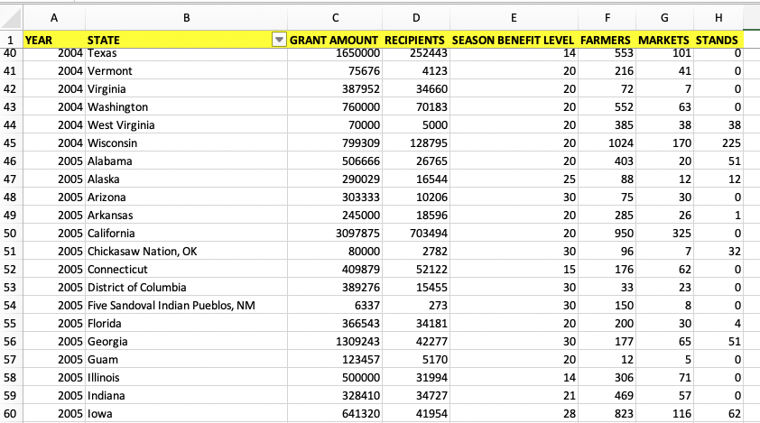 The 2004 to 2020 datasets for WIC FMNP and SFMNP are available on the USDA website in downloadable PDF formats. Using Adobe Acrobat PDF to Excel convertor, I converted the PDF files into excel sheets for each year. All the PDF, barring one, were unlocked files and hence the conversion was generally clean. PDF files from year 2015 for both programs were password protected and the tool was not able to convert the data into Excel files. Hence, for 2015 I had to manually key in the data. I used OpenRefine and Excel to transform and clean the data and then combined the yearly data for each program to generate one spreadsheet for each program.