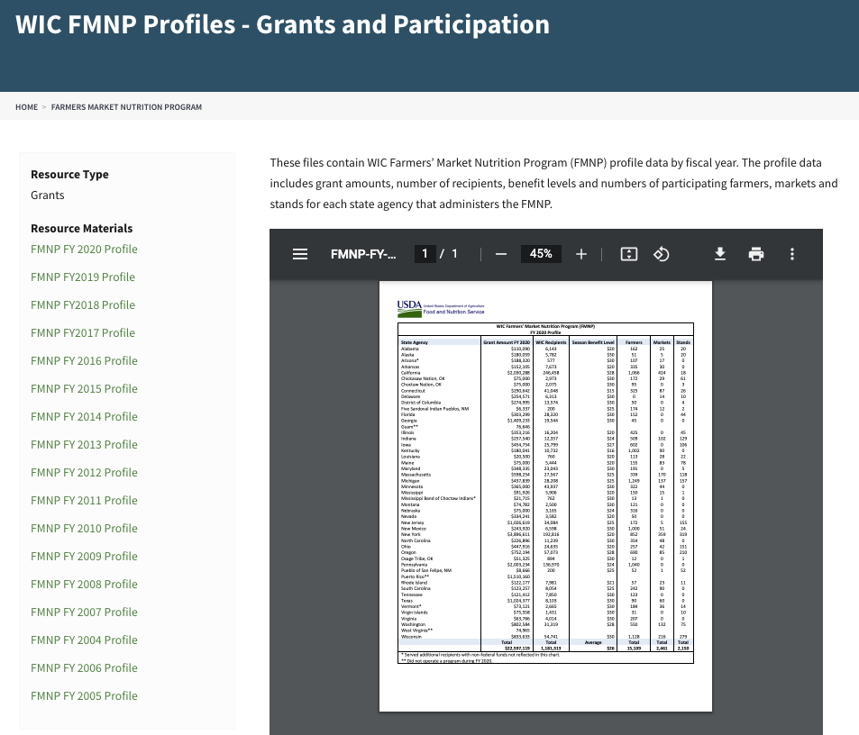 2. WIC Farmers’ Market Nutrition Program (FMNP) associated with the Special Supplemental Nutrition Program for Women, Infants and Children (Datasets – from 2004 to 2020)
