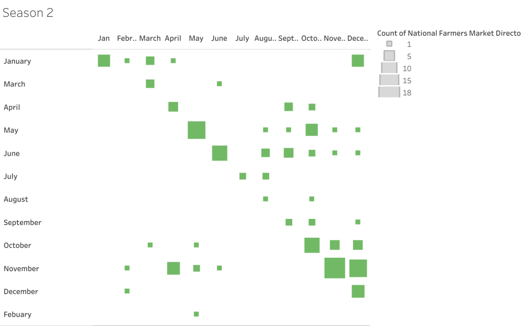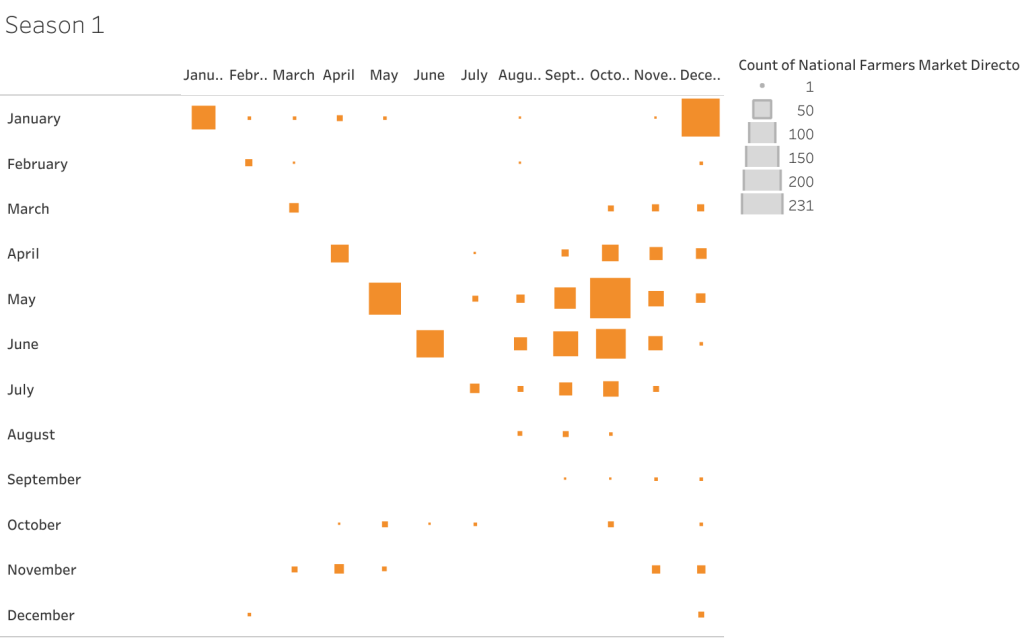Seasonally markets tend to have four seasons of operations, with a very small percentage of markets having a fourth season. 203 markets operated through the year (January to December) and 231 markets operated from May to October.