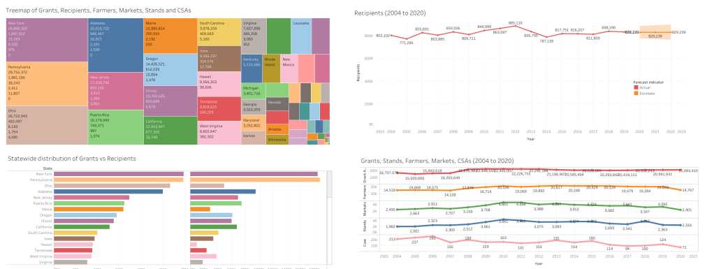 Graphs using the USDA data on WIC and SFMNP programs indicate that recipients, farmers and markets supporting the two programs have generally gone down over the years. State of New York outranks all other states for both the programs.