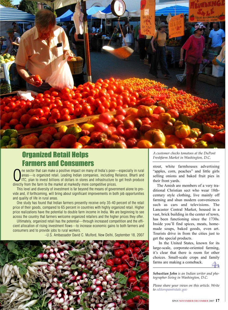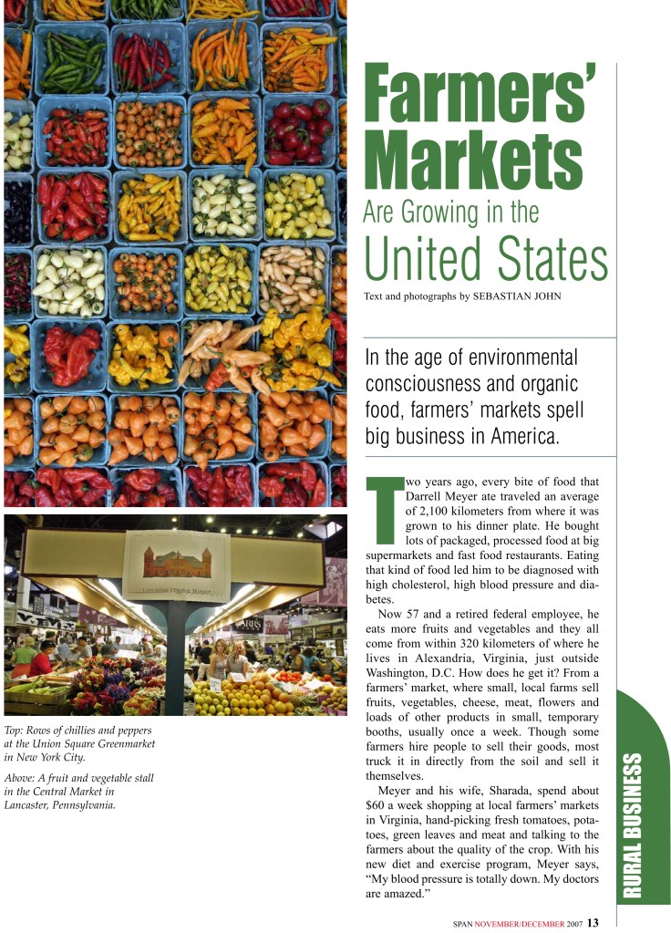 I grew up in Tanzania, India and the UAE, where I was exposed to the concept of farmers selling directory to consumers. It was an accepted feature of daily life and not much thought was put into it. After I moved to the US in mid-2000s the way I saw, bought and consumed food changed dramatically. As much as I was used to food stores in other countries the concept of a food store in the U.S. is moderately to extremely different. I was in awe of the range of products offered in an average store and at the same time struck by fact that I had no connect to the food that I was buying or eating. In 2006 a friend in the DC area introduced me to a farmers’ market and I was kind of mesmerized by it. To me the U.S. farmers’ markets were a reminiscence of the markets that I was used to but realized that they were much different. The U.S. farmers’ markets are centers of business, hubs of social interactions, and support food programs which are not that common in other countries. Thus began a journey into understanding, learning and buying from U.S. farmers. In 2007 I wrote a article for SPAN, a cultural magazine published by the U.S. Embassy in India. Since then 2007 I have been photographing farmers’ markets whenever I travel in the U.S.